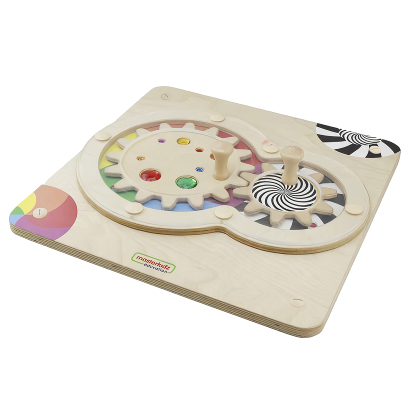 На панели расположены шестерни с ручками, каждая из которых вращается с разной скоростью, на каждой шестерёнке имеются красочные камни. Ребёнок может двумя руками одновременно вращать механизмы, что способствует развитию правого и левого полушарий мозга.