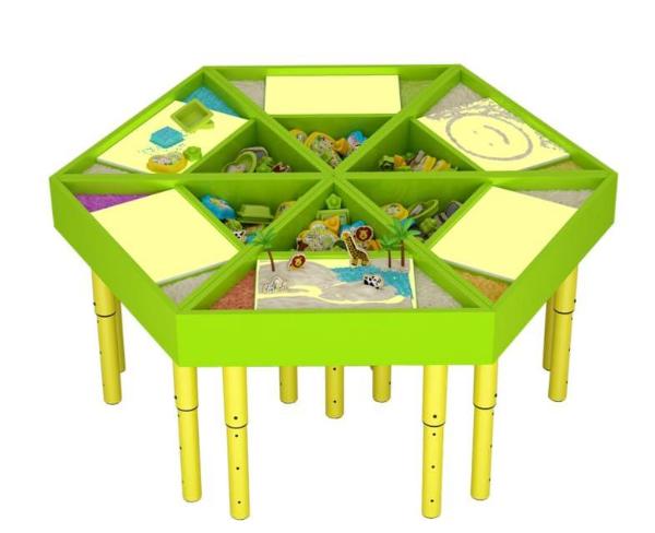 Внутри столешницы спрятан световой планшет для рисования песком и три отделения для хранения: песка, формочек и элементов ландшафта. Подсветка работает в трех режимах и имеет 16 вариантов цветов.