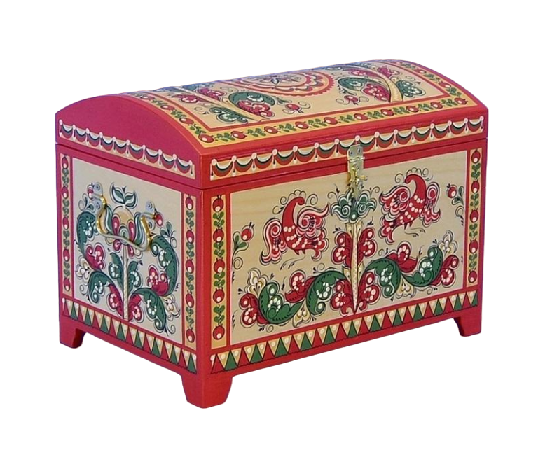 Изготовлен из берёзовой фанеры, расписан гуашевыми и темперными красками, покрыт матовым лаком. Фурнитура - латунь.