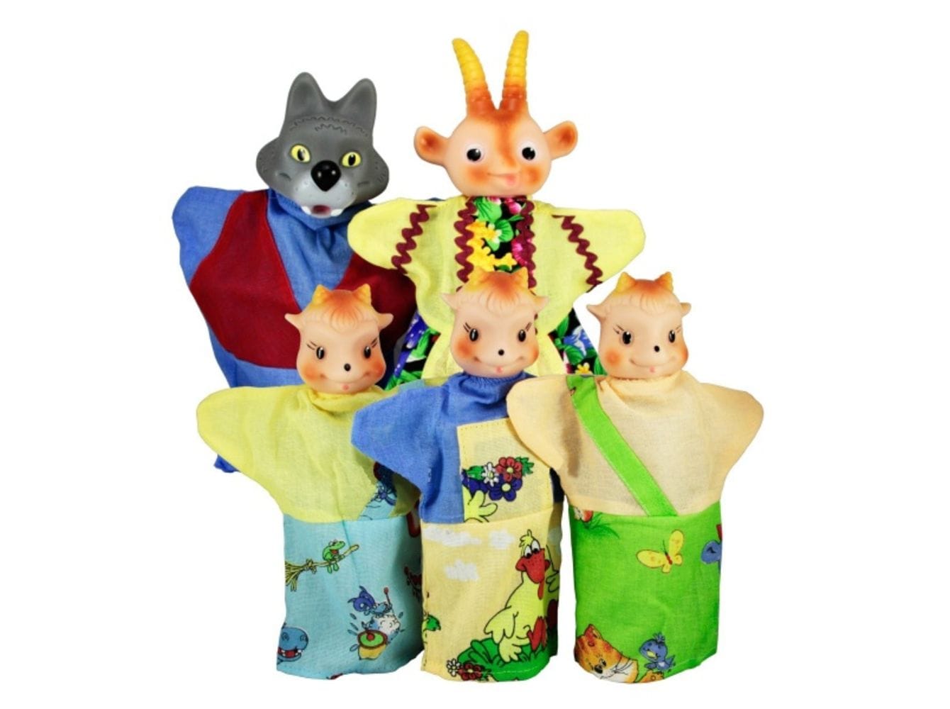 Кроме козлят имеются мама-коза и волк. Куклы-перчатки, изображающие персонажей сказки, состоят из головы, изготовленной из ПВХ, и собственно перчатки из хлопчатобумажной ткани.